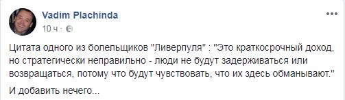 "Цитата одного из болельщиков "Ливерпуля": "Это краткосрочный доход, но стратегически неправильно – люди не будут задерживаться или возвращаться, потому что будут чувствовать, что их здесь обманывают." И добавить нечего..." – пишет журналист Vadim Plachinda в Facebook и приводит скандальное фото.