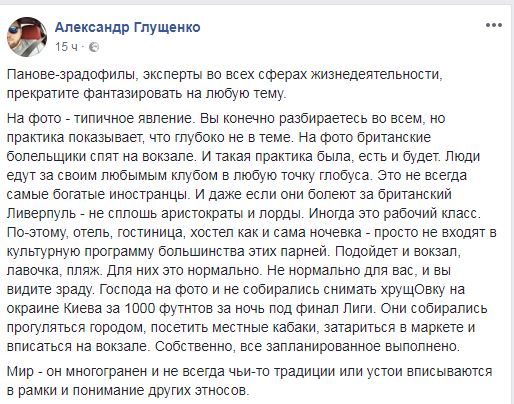 "На фото – типичное явление. Вы, конечно, разбираетесь во всем, но практика показывает, что глубоко не в теме. На фото британские болельщики спят на вокзале. И такая практика была, есть и будет. Люди едут за своим любимым клубом в любую точку глобуса. Это не всегда самые богатые иностранцы. И даже если они болеют за британский "Ливерпуль" – не сплошь аристократы и лорды. Иногда это рабочий класс. Поэтому отель, гостиница, хостел, как и сама ночевка, – просто не входят в культурную программу большинства этих парней. Подойдет и вокзал, лавочка, пляж. Для них это нормально. Не нормально для вас, и вы видите зраду. Господа на фото и не собирались снимать хрущОвку на окраине Киева за 1000 фунтов за ночь под финал Лиги. Они собирались прогуляться городом, посетить местные кабаки, затариться в маркете и вписаться на вокзале. Собственно, все запланированное выполнено", – отмечает в Facebook Александр Глущенко.