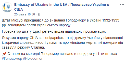 "Штат Миссури присоединился к признанию Голодомора в Украине 1932-1933 гг. Геноцидом против украинского народа. Губернатор штата Эрик Гретенс выдал соответствующую прокламацию. Спасибо народу США за солидарность и поддержку Украине в восстановлении исторической справедливости в память о миллионах жертв, умерших от произвола режима Сталина ", - говорится в сообщении.