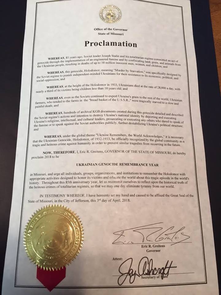Губернатор штата Миссури Эрик Гретенс выдал прокламацию, в которой признал Голодомор 1932-33 года геноцидом украинского народа. Об этом сообщает посольство Украины в США на своей странице в соцсети.