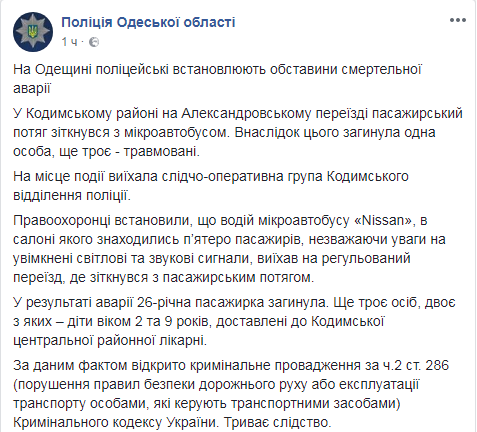 Как сообщили в ГУНП в Одесской области, выяснилось, что в результате аварии погибла 26-летняя пассажирка. Еще три человека, двое из которых – дети 2 и 9 лет, доставили в Кодымскую центральную районную больницу.