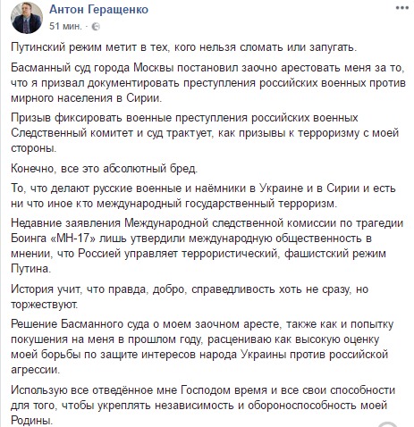 "Путинский режим метит в тех, кого нельзя сломать или запугать. Басманный суд Москвы принял решение заочно арестовать меня за то, что я призвал документировать преступления российских военных против мирного населения в Сирии. Призыв фиксировать военные преступления российских военных, Следственный комитет и суд трактует, как призывы к терроризму с моей стороны. Конечно все это абсолютный бред", - написал нардеп.