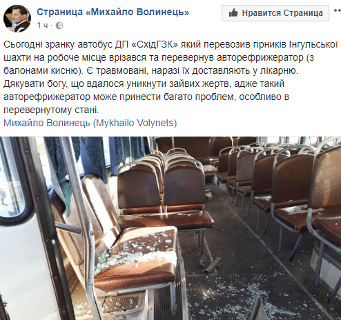 "Сегодня утром автобус ГП "ВостГОК", перевозивший горняков Ингульской шахты на рабочее место, врезался и перевернул авторефрижератор (с баллонами кислорода). Есть раненые, пока их доставляют в больницу", - написал Михаил Волынец.