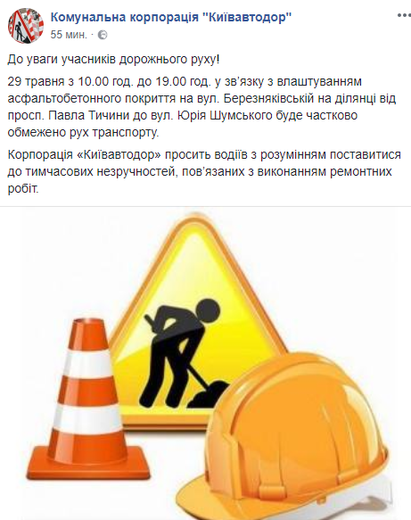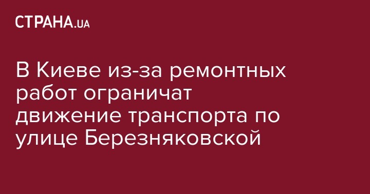 В обнародованном в соцсети во вторник утром сообщении отмечается, что в связи с проведением ремонтных работ движение автотранспорта будет ограничено на ул. Березняковской на участке от ул. Павла Тычины до ул. Юрия Шумского.