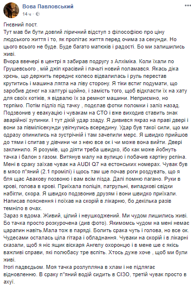 "И тут дикий удар сзади. Я как раз смотрел на правую дверь и она за полмилисекунды вогнулась во внутрь. Удар был такой силы, что мы сразу оказались на встречной полосе и там зацепили Mercedes. Я быстро пришел в чувство и спросил у девушки, все ли с ней хорошо и может ли она выйти. Дверь заклинило. Я понял, что действовать нужно оперативно, так как может взорваться баллон с газом. Вытащил девушку из машины и увидел картину Репина: мне в зад въехал чувак на AUDI Q7 на эстонских номерах. Он был в мясо пьяный и начал говорить, что позвонит Авакову", – написал в соцсети Павловский.
