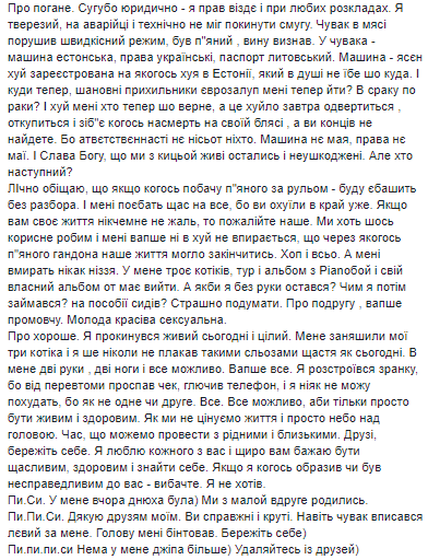 "Чудесами не повредилась гитара и остальная аппаратура. Но вот тачка – разлупленная в хлам и возобновлению не подлежит, пьяный водитель сидит в СИЗО, а третий чувак – просто в шоке", – добавил музыкант.