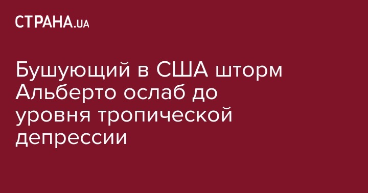 Субтропический шторм "Альберто", ранее обрушившийся на юго-восточное побережье США, ослаб до уровня тропической депрессии. Об этом сообщили в Национальном центре США по слежению за ураганами,передает Интерфакс.