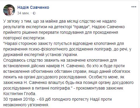 "В связи с тем, что за почти два месяца следствие не предоставило результатов экспертизы на детекторе "правды", Надеждой Савченко принято решение прервать голодание для прохождения повторной экспертизы", - говорится в сообщении.