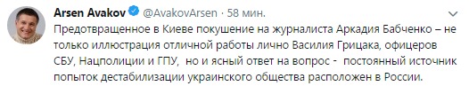 "Предотвращенное в Киеве покушение на журналиста Аркадия Бабченко – не только иллюстрация отличной работы лично Василия Грицака, офицеров СБУ, Нацполиции и ГПУ, но и ясный ответ на вопрос - постоянный источник попыток дестабилизации украинского общества расположен в России", - написал Аваков в своем микроблоге в соцсети Twitter в среду.
