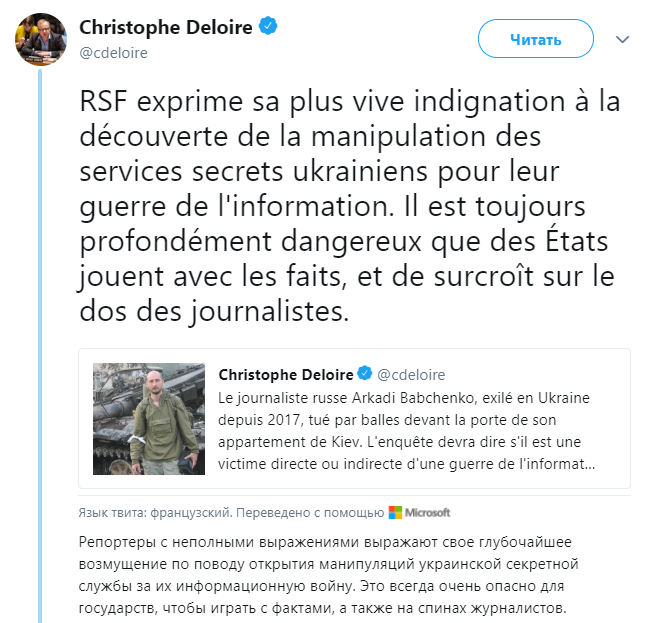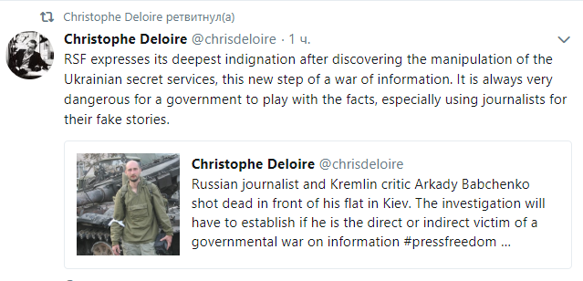 "Reporters sans frontières выражает глубокое возмущение в связи с обнаружением манипуляции Службы Безопасности Украины в их информационной войне. Всегда очень опасно для государств играть с фактами за спинами журналистов", - говорится в сообщении на французском языке.