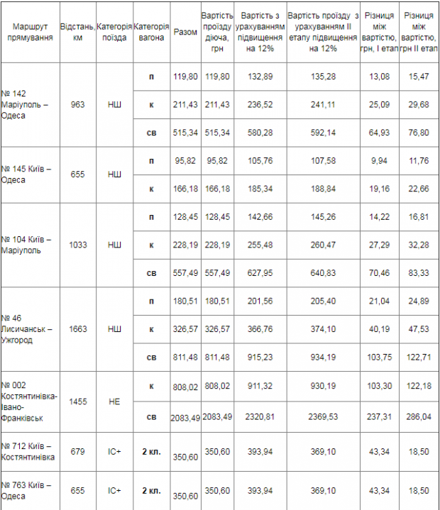 "Укрзализныця" показывала, как поменяется стоимость проезда по некоторым направлениям на всех этапах подорожания.