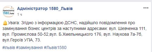 "Сообщение о минировании бизнес-центров по следующим адресам: ул. Шевченко 111, ул. Промышленная 50-52, ул. Б. Хмельницкого 176, ул. Научная 7а-7б, ул. Героев УПА, 73", - говорится в сообщении.