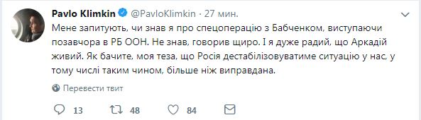 29 мая 2018 года на специальном заседании Совета безопасности ООН Павел Климкин заявил, что еще рано делать выводы о том, кто стоит за убийством журналиста Аркадия Бабченко, однако подчеркнул, что Кремль и ранее прибегал к разным видам дестабилизации Украины, включая политические убийства.