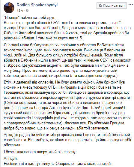 "Убийца" Бабченко - мой друг. Собственно, то, что он пошел в СБУ - это и есть та великая победа, у которой сегодня было так много родителей", - написал Шовковшитный.