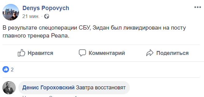По мнению его коллеги Дениса Поповича, Зидана действительно убрала украинская разведка, но блогер Денис Гороховский успокоил, что СБУ уже завтра восстановит Зидана в должности.