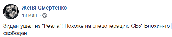 "Зидан ушел из "Реала"! Похоже на спецоперацию СБУ. Блохин-то свободен", - считает журналист Евгений Смертенко.