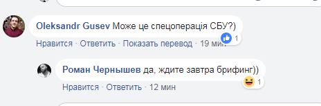 В комментариях к видео Oleksandr Gusev пошутил, что это "может спецоперация СБУ", намекая на постановку со смертью журналиста Аркадия Бабченко. В ответ на это Чернышев в шутку пообещал "завтра брифинг".