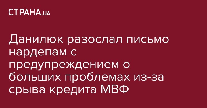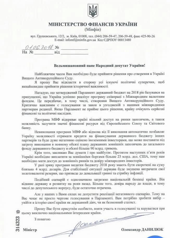 Министр финансов Александр Данилюк разослал народным депутатам письмо, в котором призывает немедленно принять закон об антикоррупционном суде и тем самым разблокировать финансирование от МВФ. Ранее он направил письмо членам "Большой семерки".