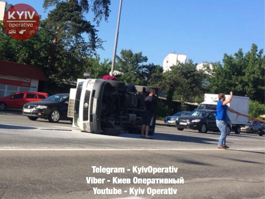 В Киеве на Броварском проспекте, возле АЗС KLO, перевернулся грузовик Volkswagen.