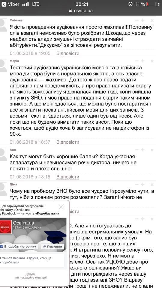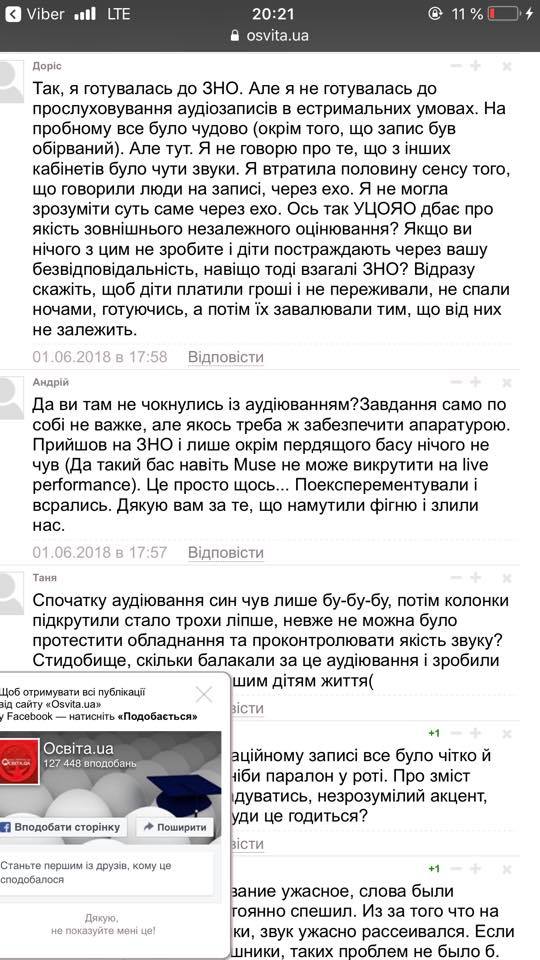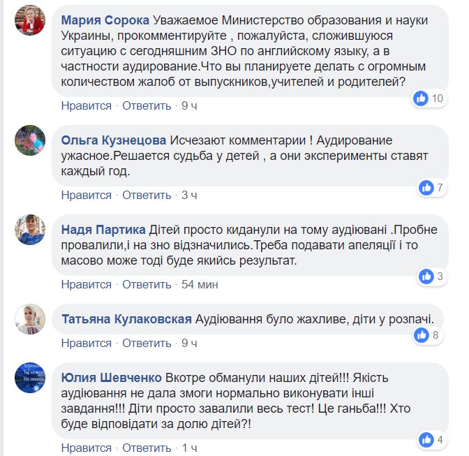 Пользовательница Мария Сорока пишет: "Уважаемое Министерство образования и науки Украины, прокомментируйте , пожалуйста, сложившуюся ситуацию с сегодняшним ЗНО по английскому языку, а в частности аудирование.Что вы планируете делать с огромным количеством жалоб от выпускников,учителей и родителей?".