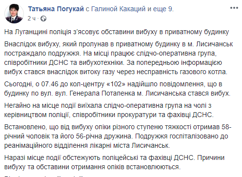 "От взрыва ожоги различной степени тяжести получил 58-летний мужчина и его 56-летняя жена. Супруги госпитализированы в реанимационное отделение больницы города Лисичанск. Сейчас место происшествия обследуют полицейские и специалисты ГСЧС. Причины взрыва и обстоятельства получения ожогов устанавливаются", – сказано в сообщении.