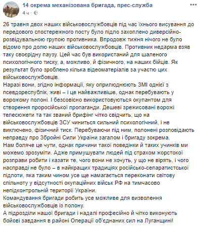 "26 мая двух военнослужащих похитили диверсионно-разведывательные группы противника. В течение недели ничего не было известно о судьбе наших военнослужащих", - сообщается в заявлении бригады в Facebook.