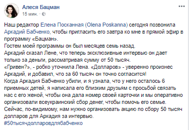 "Аркадий сказал, что теперь эксклюзивные интервью он дает только за деньги, рассматривая сумму от 50 тысяч. "Гривен?", - робко уточнили мы. "Долларов" - уверенно произнес Аркадий, и добавил, что за 60 тысяч он точно согласится! Когда Аркадия Бабченко убили, и я узнала, что у него осталось 6 приемных детей, я написала его близким друзьям с просьбой связать нас с его женой, чтобы она дала номер своей карточки и мы оперативно организовали всеукраинский сбор денег, чтобы помочь его семье.