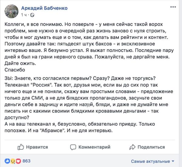 По словам журналиста, он "безумно устал" и находится "на грани нервного срыва", поэтому не будет тратить время и силы бесплатно. Также Бабченко заявил, что на его условия якобы сразу же согласился телеканал "Россия", однако журналист отказался.