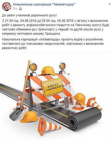 В сообщении говорится о том, что с 21:00 4 июня до 20:00 5 июня перекроют первую и вторую полосы движения в направлении жилого массива Троещина. Здесь будут проводиться работы по ремонту асфальтобетонного покрытия.
