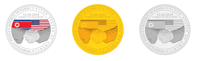 При этом на каждой монете изображено рукопожатие, слева - флаг КНДР, справа - США.
