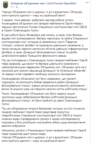Командующий ООС также заявил, что подразделения, выполняющие боевые задания в районе ДФС, строго соблюдают режим прекращения огня и ни разу не создали угрозы жизни рабочих станции. Он также предоставил предложения по обеспечению безопасности рабочих ДФС, которые приняты к сведению Александром Хугом.