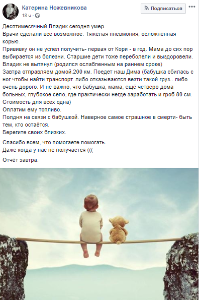 "Десятимесячный Владик сегодня умер. Врачи сделали все возможное. Тяжёлая пневмония, осложнённая корью. Прививку он не успел получить- первая от кори - в год. Мама до сих пор выбирается из болезни. Старшие дети тоже переболели и выздоровели. Владик не вытянул (родился ослабленным на раннем сроке)", - написала в соцсети волонтер.
