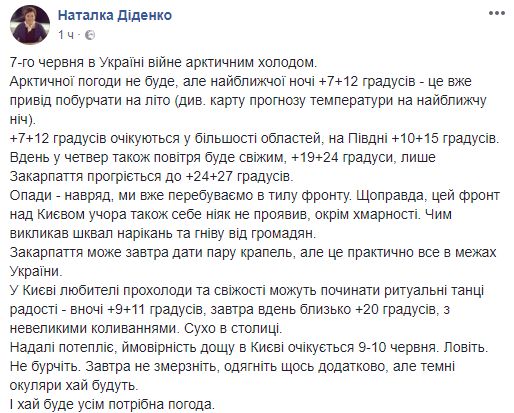 Синоптик Наталья Диденко сообщила, что ближайшей ночью с 6 на 7 июня в Украине температура снизится до +7...+12.