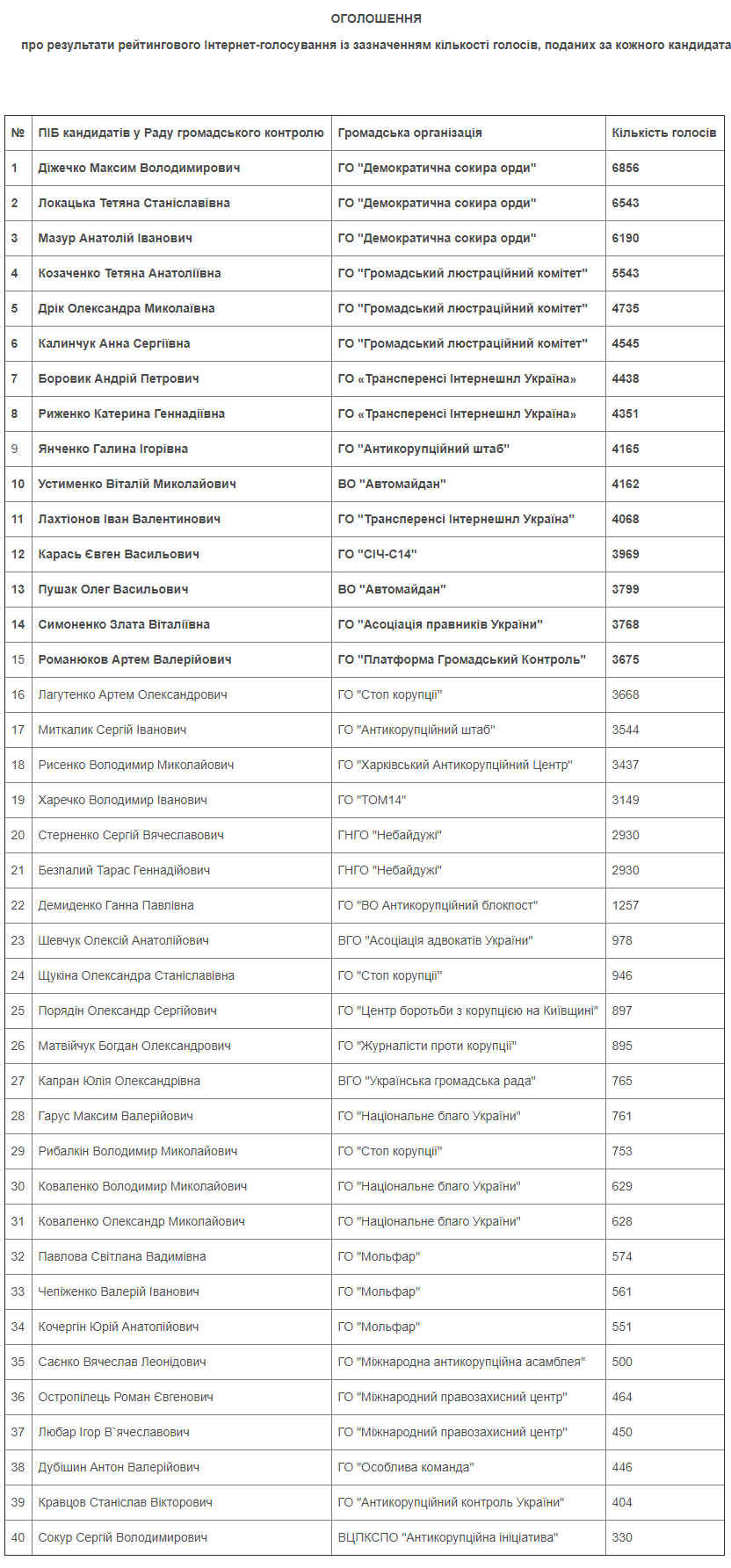 Четверо из 15 кандидатов уже были членами совета предыдущего созыва: Виталий Устименко ("Автомайдан"), Галина Янченко ("Антикоррупционный штаб), Екатерина Рыженко (Transparency International Ukraine) и Артем Романюков (Платформа "Громадський контроль").