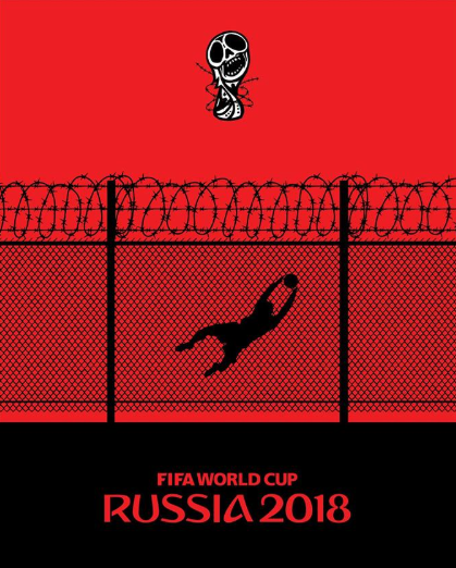 На плакатах Ермоленко, в частности, изображены катастрофа рейса MH-17 и окровавленный талисман чемпионата, который проводится в России.
