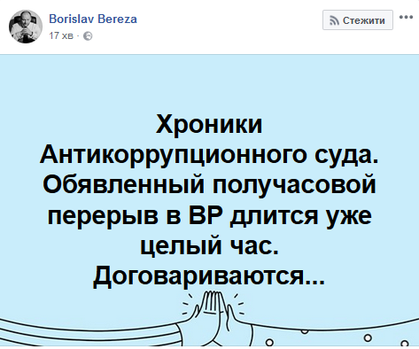 12.17 Народные депутаты в соцсетях иронично комментируют долгий перерыв. Вот что у себя в Facebook разместил нардеп Борислав Береза.