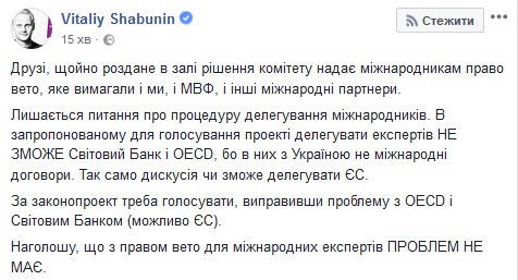"Друзья, только что раздали в зале решение Комитета, которое предоставляет международникам право вето, которое требовали и мы, и МВФ, и другие международные партнеры.
