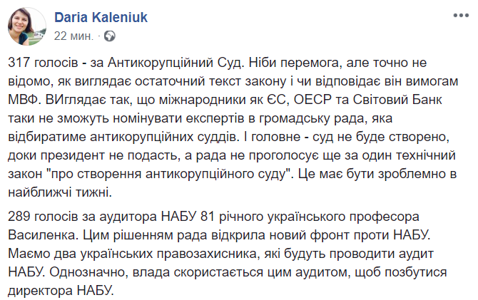 Похоже, что международники - такие как ЕС, ОЭСР и Всемирный Банк не смогут номинировать экспертов в общественный совет, который будет отбирать антикоррупционных судей. И главное - суд не будет создан, пока президент не подаст, а Рада не проголосует еще за один технический закон "о создании антикоррупционного суда". Это должно быть сделано в ближайшие недели", - пишет антикоррупционная активистка Дарья Каленюк.