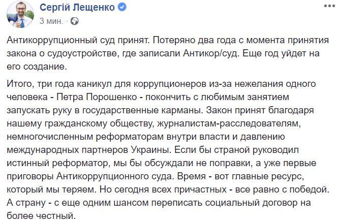 "Антикоррупционный суд принят. Потеряно два года с момента принятия закона о судоустройстве, где записали Антикор/суд. Еще год уйдет на его создание.