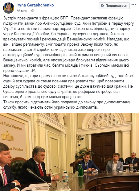 В четверг, 7 июня, Петр Порошенко на встрече с депутатами фракции "Блок Петра Порошенко" призвал поддержать закон об Антикоррупционном суде.