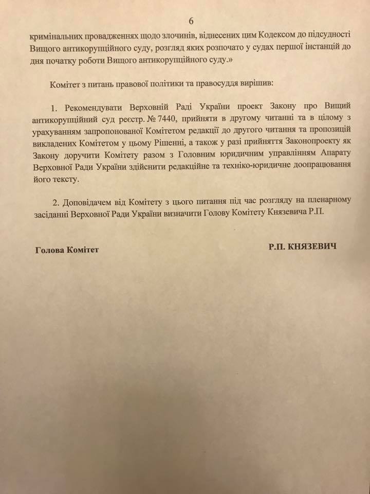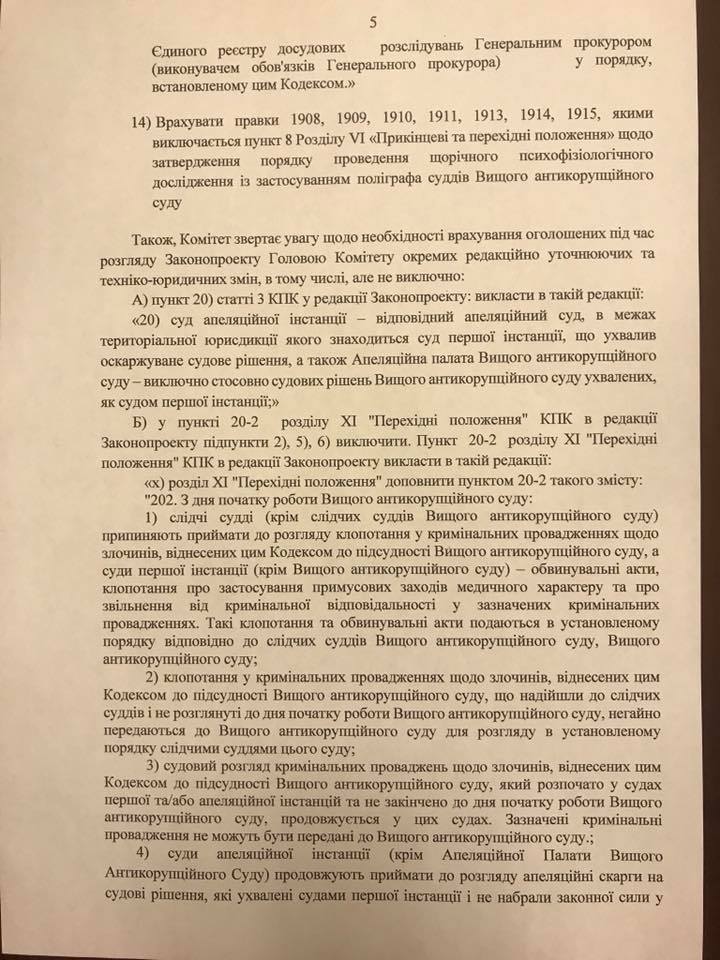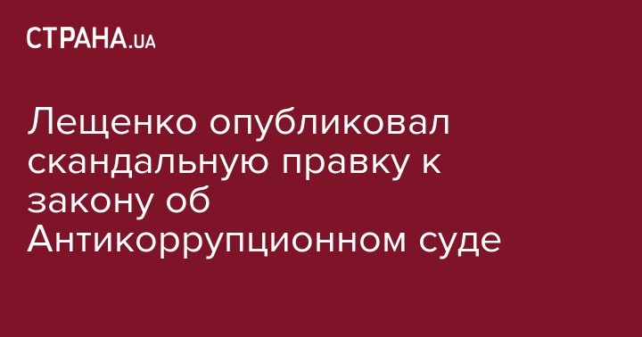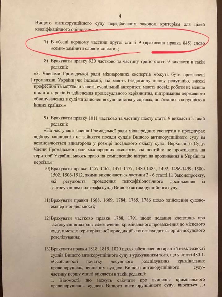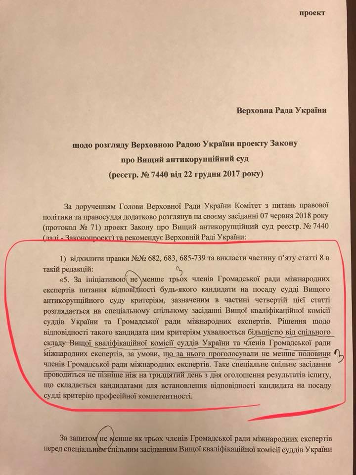 "Окончательная редакция закона об Анткорупционном суде. Если международные эксперты (трое из шести) признали судью нечестным, то вето может быть преодолено на СОВМЕСТНОМ заседании Совета международных экспертов и Высшей квалификационной комиссии судей при УСЛОВИИ, что трое из шести международных экспертов поддержат преодоление вето", - пишет Лещенко.