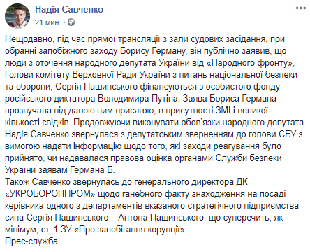 "Недавно, во время прямой трансляции из зала судебных заседания, при избрании меры пресечения Борису Герману, он публично заявил, что люди из окружения народного депутата Украины от "Народного фронта", Председателя комитета Верховной Рады Украины по вопросам национальной безопасности и обороны, Сергея Пашинского финансируются из личного фонда российского диктатора Владимира Путина. Заявление Бориса Германа прозвучало под данной им клятвой, в присутствии СМИ и большого количества свидетелей. Продолжая выполнять обязанности народного депутата Надежда Савченко обратился с депутатским обращением к председателю СБУ с требованием предоставить информацию о том, какие меры реагирования были приняты, давалась ли правовая оценка органами Службы безопасности Украины заявлениям Германа Б.