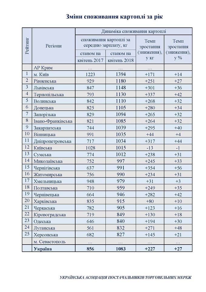 Он пишет, что пятерка лидеров по увеличению потребления картофеля за год выглядит следующим образом: Черниговская область +354 кг, Тернопольская +337 кг, Днепропетровская +317 кг, Львовская +301 кг, Закарпатская область +295 кг.