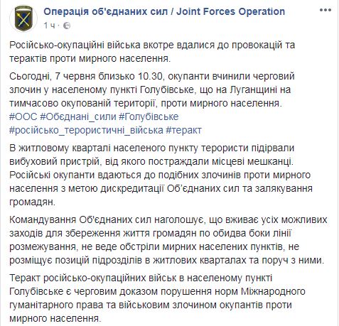 "Российско-оккупационные войска в очередной раз прибегли к провокациям и терактам против мирного населения. Сегодня, 7 июня около 10:30, оккупанты совершили преступление в населенном пункте Голубовское, что на Луганщине на временно оккупированной территории, против мирного населения", - сказано в нем.