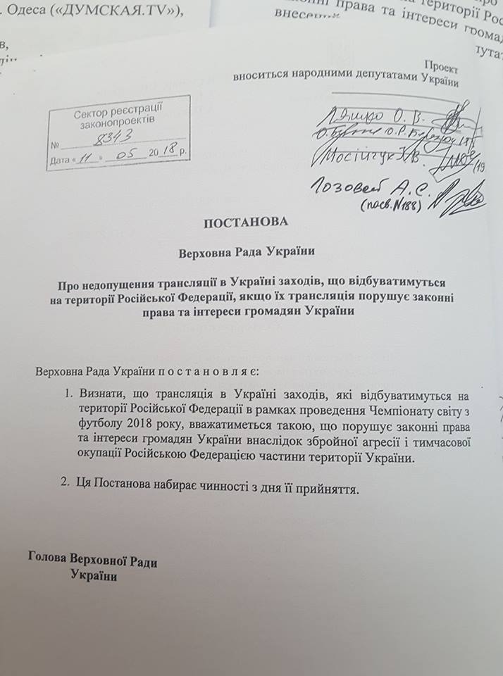 6 июня Комитет Рады по вопросам свободы слова поддержал проект постановления о запрете трансляции матчей чемпионата мира по футболу 2018 года в России на территории Украины.