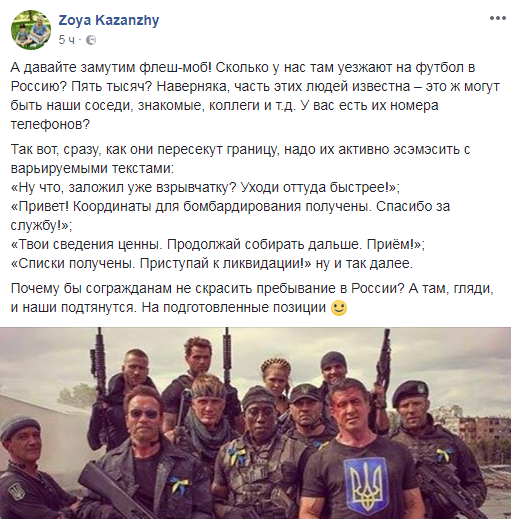 "А давайте замутим флеш-моб! Сколько у нас там уезжают на футбол в Россию? Пять тысяч? Наверняка, часть этих людей известна – это ж могут быть наши соседи, знакомые, коллеги и т.д. У вас есть их номера телефонов? Так вот, сразу, как они пересекут границу, надо их активно эсэмэсить с варьируемыми текстами: "Ну что, заложил уже взрывчатку? Уходи оттуда быстрее!"; "Привет! Координаты для бомбардирования получены. Спасибо за службу!"; "Твои сведения ценны. Продолжай собирать дальше. Прием!"; "Списки получены. Приступай к ликвидации!" ну и так далее", - пишет Казанжи в Facebook.