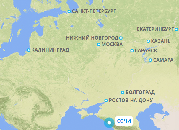 14 июня в России начинается Чемпионат мира по футболу 2018. Города, в которых пройдут матчи: Москва, Санкт-Петербург, Калининград, Сочи, Казань, Нижний Новгород, Волгоград, Самара, Саранск, Ростов на Дону, Екатеринбург.