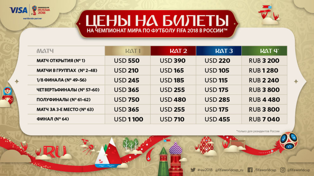 Вот цены на билеты от FIFA. Последняя колонка, где цены указаны в рублях - только для граждан России. Всего было выделено более четырех миллионов билетов.
