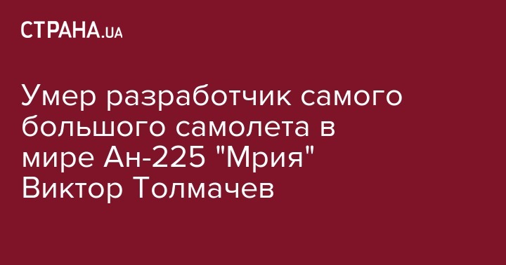 Советский авиаконструктор, разработчик самолетов Ан-124 "Руслан" и Ан-225 "Мрия" Виктор Толмачев скончался после тяжелой болезни. Ему было 83 года.
