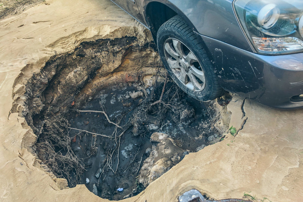 "Машина немного скатывается вниз", - отмечает жительница дома Ольга. Ее машина также стояла возле ямы, но благодаря тому, что о ЧП рассказали соседи, авто быстро убрали. А вот стоящий рядом Kia забрать некому, так как владелец машины в командировке в другом городе. По словам женщины, это уже не первый случай прорыва трубы в месте заасфальтированной площадки. Два года назад здесь из-под земли также хлестала вода.